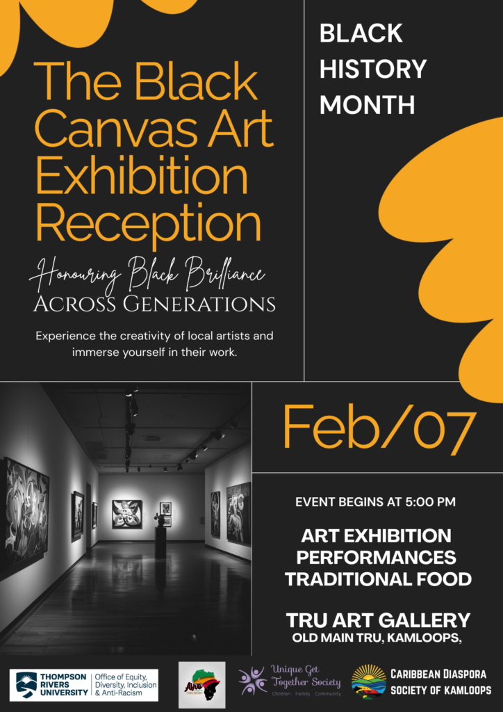The Black Canvas Art Exhibition Reception for Black History Month will be held on February 7th, 5:00 PM at the TRU Art Gallery (Old Main).